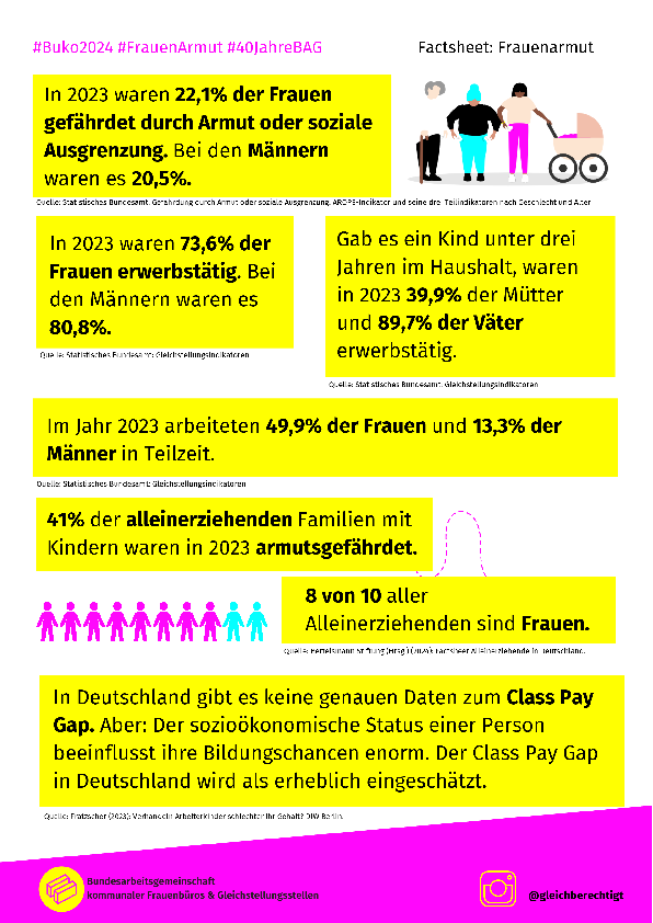 „Armut, die“ Substantiv, feminin Ar I mut“ – war das Motto der diesjährigen 28. Bundeskonferenz der kommunalen Frauen- und Gleichstellungsbeauftragten Deutschlands (am 15.-17.09.2024) die zugleich das 40-jährige Jubiläum der Bundesarbeitsgemeinschaft feierte. Factsheet Frauenarmut (PDF)