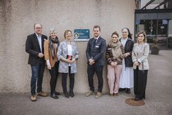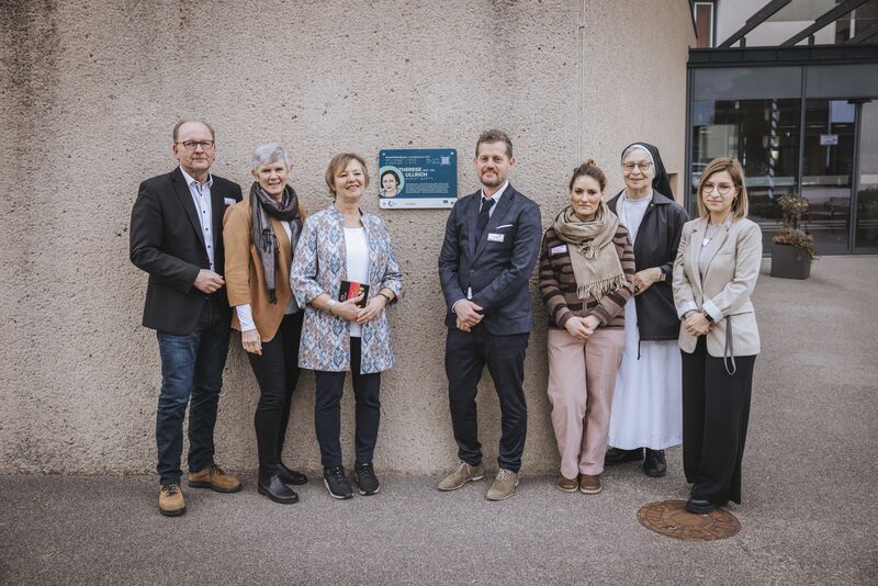 Foto: Landratsamt Landsberg am Lech von links: Bei der Enthüllung der Plakette „FrauenOrt Therese Ullrich“ im Caritas-Seniorenzentrum Heilig-Geist-Spital: Walter Gebauer, Brigitta Hofmann, Susanne Stegmaier, Thomas Koppold, Jennifer Alic, Schwester Antonia und Diana Efremenko.