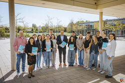 Foto: Landrat Thomas Eichinger (Bildmitte) mit Annette Ring, Schulleiterin an Realschule Kaufering, Tobias Kratschmer Koordinator für Berufsorientierung, Wirtschaftsförderin Kathrin Lenvain sowie Schülerinnen und Schülern der Realschule Kaufering.