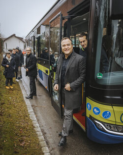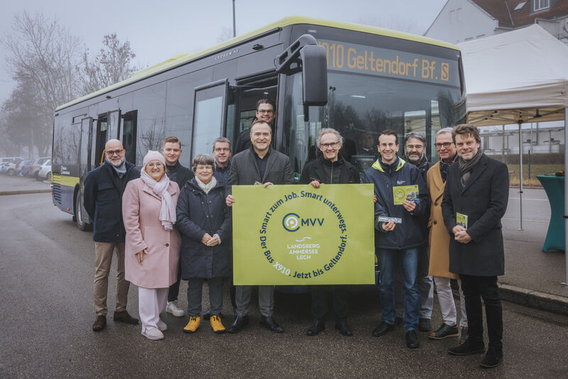Pünktlich zum Fahrplanwechsel am 14. Dezember 2025 begrüßte Landrat Thomas Eichinger am Bahnhof Geltendorf Dr. Josef Rott, Ministerialdirigent im Bayerischen Staatsministerium für Wohnen, Bau und Verkehr, Landrat Stefan Frey (Landkreis Starnberg) sowie die Bürgermeister der neu hinzugekommenen Gemeinden Windach, Eresing und Geltendorf und eine Gemeinderätin aus Inning am Ammersee. Im Anschluss überzeugten sich die geladenen Gäste bei einer gemeinsamen Fahrt mit dem neuen Bus von den modernen MVV-Standards und hohen Qualitätsanforderungen der Expressbuslinie.