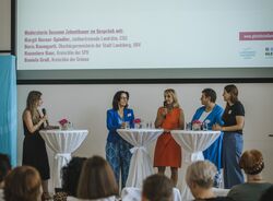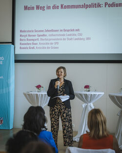 Im Podiumsgespräch standen vier erfahrene und erfolgreiche Kommunalpolitikerinnen aus unterschiedlichen Parteien Rede und Antwort: Es waren dies Margit Horner-Spindler (stellvertretende Landrätin, CSU), Doris Baumgartl (Oberbürgermeisterin der Stadt Landsberg, UBV), Hannelore Baur (Kreisrätin, SPD) sowie Daniela Groß (Kreisrätin, Bündnis 90/Die Grünen). Der Radio-Moderation Susanne Zehentbauer gelang es mit ihren Fragen, einen persönlichen, authentischen Einblick in die Kommunalpolitik aus weiblicher Perspektive zu schaffen.