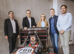 Foto 1: v.l.n.r. TTZ-Geschäftsführer Julian Stähler, Landrat Thomas Eichinger, Oberbürgermeisterin Doris Baumgartl sowie die wissenschaftlichen TTZ-Leiter Prof. Dr.-Ing. Carsten Markgraf und Prof. Dr. rer. nat. Sebastian Dorn am TTZ-Standort Am Papierbach vor dem autonom fahrenden Elektro-Rennwagen der THA-Studierenden des Vereins StarkStrom Augsburg e.V.