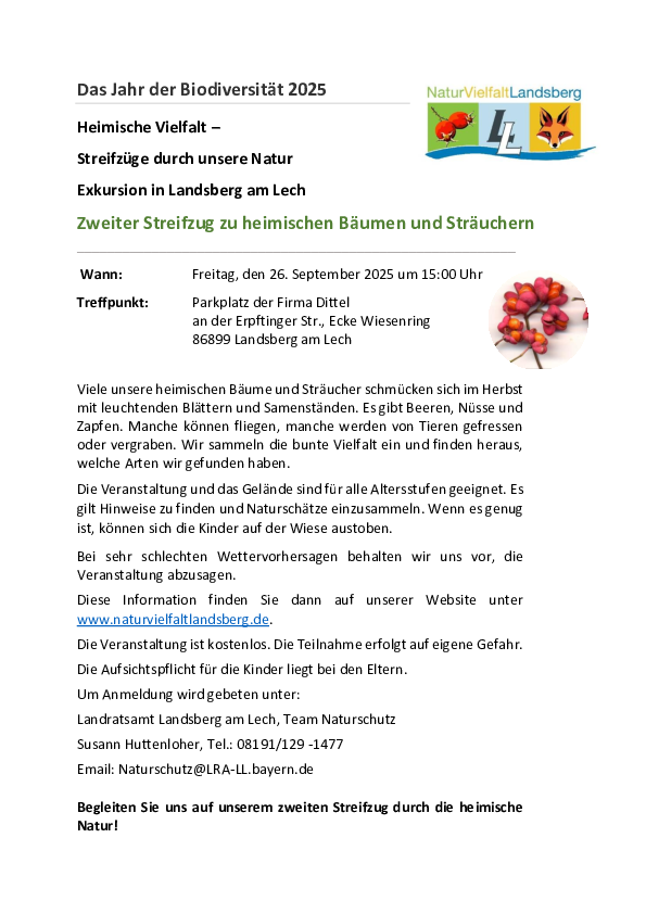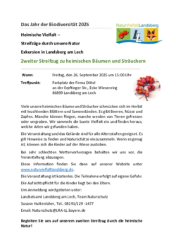 Am Freitag, den 26. September 2025, um 15:00 Uhr, startet daher in Landsberg am Lech der zweite Streifzug im Rahmen des Jahres der Biodiversität 2025. Treffpunkt ist der Parkplatz der Firma Dittel an der Erpftinger Straße / Ecke Wiesenring. Gemeinsam mit Interessierten aller Altersgruppen geht es auf eine Exkursion zu heimischen Bäumen und Sträuchern.