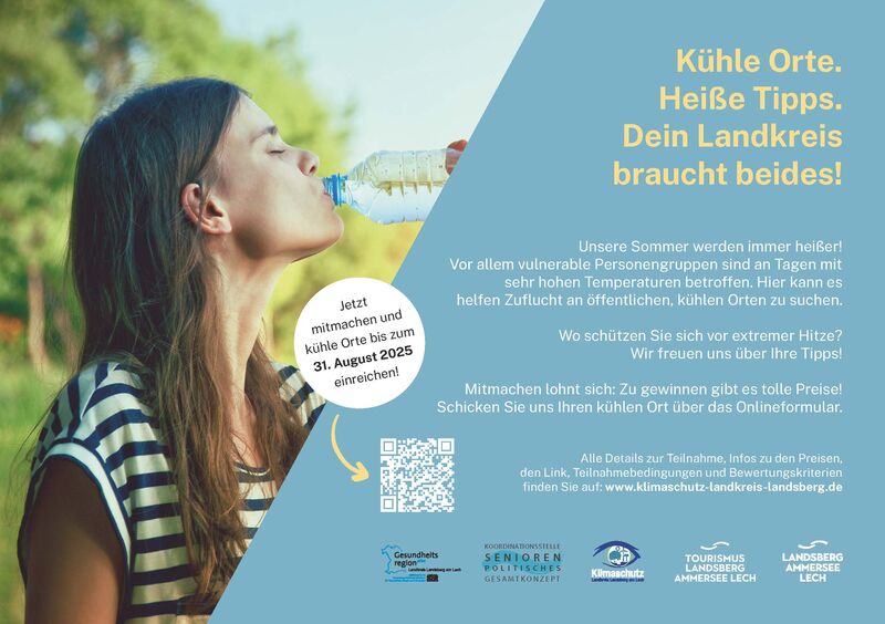 Aus diesem Grund möchten die Fachstelle Klimaschutzmanagement, die Gesundheitsregion Plus, die Koordinationsstelle, Seniorenpolitisches Gesamtkonzept, die Regionenmarke, der Tourismusverband und der zentrale Dienst im Landratsamt einen landkreisweiten Wettbewerb starten: Ziel ist es, Orte im Landkreis zu finden, die bei extremer Hitze Kühlung versprechen, wie z.B. Kirchen, Waldwege, Badeseen usw. und eine Karte mit eben diesen Orten zu erstellen. Alle Interessierten sind eingeladen ihre Tipps an kühlen Orten im Landkreis bis zum 31. August 2025 über das Online-Formular, welches u.a. auf der Webseite der Fachstelle Klimaschutzmanagement zu finden ist, zu schicken.