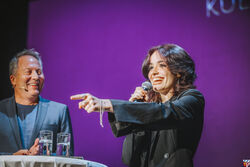 Last but not least sprach Franz Hartmann, Objektkünstler und Initiator von „Kunst hält Wache“ über den Werdegang von Betty Baldauf Caiva. Seine Ausführungen wurden von Caivas begeisterter und begeisternder Videobotschaft unterstrichen – Techno Sound ließ den Zuschauerraum im Stadttheater beben… Caiva ist seit Anbeginn eine zielstrebige Künstlerin– eine Suchende und Findende und sie ist auch eine Reisende, daher konnte sie an der Preisverleihung nicht persönlich teilnehmen, ein Umstand, den sie sehr bedauert hat.