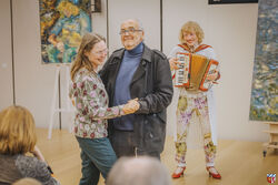 Angelika Böhm-Silberhorn feierte diesen Abend auf ihre ganz eigene, spontane Weise. Zur Musik von Birgit Otter auf der Schlüsselharfe zog sie ihren Mann Herrmann vom Stuhl und legte einen Walzer aufs Parkett. In ihrer berührenden Dankesrede ließ sie jene nicht unerwähnt, jene, die sie immer unterstützt haben, die sie in ihre Gärten gelassen haben und auch jene, die Kunst ankaufen ehrte sie; denn was wäre Kunst ohne Käuferinnen oder Käufer, ohne Mäzene?