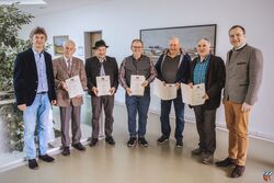Foto: Tonnemacher (von links nach rechts): Ltd. Vermessungsdirektor Steffen Kirchner, Erwin Friesenegger (Penzing, 25 Jahre), Josef Schamper (Apfeldorf, 25 Jahre), Leonhard Bader (Apfeldorf, 25 Jahre), Xaver Pichlmeyr (Hofstetten, 40 Jahre), Ernst Pittrich (Finning, 25 Jahre) und Landrat Thomas Eichinger.