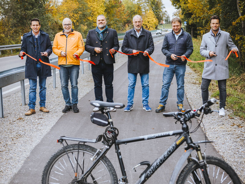 Das symbolische Eröffnungsband durchtrennten Bürgermeister Marco Dollinger (Gemeinde Kinsau), Bürgermeister Gerhard Schmid (Gemeinde Apfeldorf), Andreas Lenker (Abteilungsleitung Staatliches Bauamt Weilheim), Bernhard Panholzer (Strommer Tiefbau GmbH), Bernd Meckel (Vorstandsvorsitzender ADFC Landsberg) und Rainer Mahl (Sachgebietsleitung Kreisentwicklung & Wirtschaftsförderung, Landkreis Landsberg am Lech).