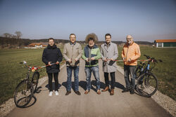 Foto: Leitenstorfer - Das Eröffnungsband durchtrennen – von links: Daniel Rogg (Bauunternehmen Kutter), Landrat Thomas Eichinger, Erwin Karg (1. Bürgermeister der Gemeinde Fuchstal), Rainer Mahl (Sachgebietsleiter Kreisentwicklung & Wirtschaftsförderung im Landratsamt Landsberg) und Bernd Meckel (ADFC Kreisverband)