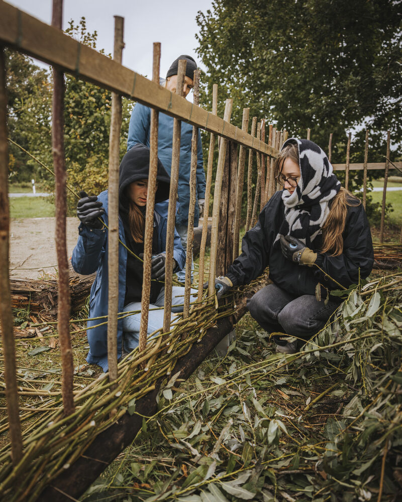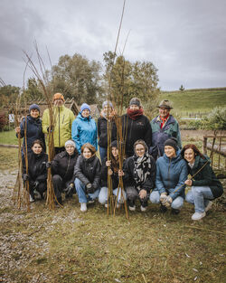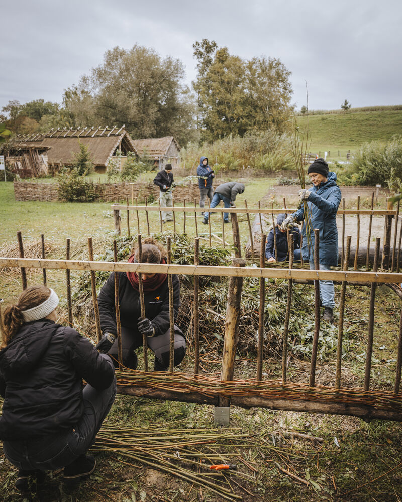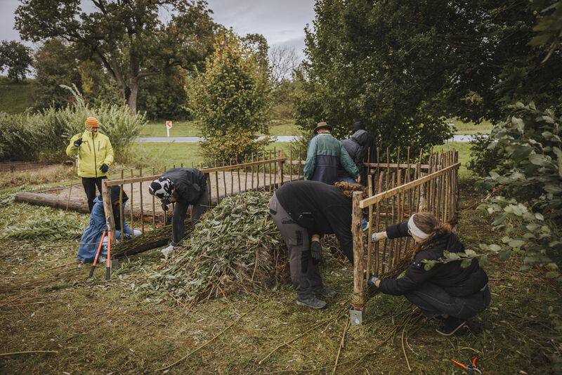 Auch im Steinzeitdorf Pestenacker wurde am Montag, 06.10. erneut gelebte Inklusion sichtbar: Auszubildende und eine Praktikantin aus dem Landratsamt Landsberg am Lech arbeiteten gemeinsam mit Beschäftigten der IWL-Werkstätte Landsberg am Lech an einem nachhaltigen Projekt. Trotz unbeständigen Wetters flochten die engagierten Teilnehmerinnen und Teilnehmer eine stabile Weidenumrandung für den Komposthaufen des Museumsdorfes.