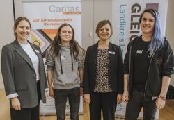 Foto Leitenstorfer von links: Anna Kohlhund (LGBTIQ+ Beratungsstelle Oberbayern), Lino Sliwinski (Vida Landsberg e.V), Susanne Stegmaier (Kommunale Gleichstellungs-beauftragte), Tori Bartl (Vida Landsberg e.V.)