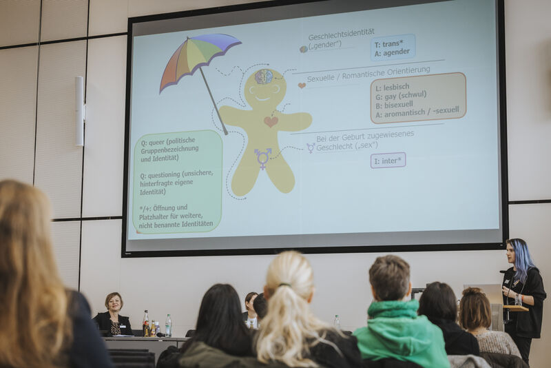 Eine wichtige Frage aus dem Publikum lautete, ab welchem Alter sexuelle Orientierung und geschlechtliche Identität bewusst werden. Studien zeigen, dass 16 Prozent (sexuelle Orientierung) bzw. 28 Prozent (geschlechtliche Identität) angeben, dies schon immer gewusst zu haben; ein weiterer deutlicher Erkenntnis-Peak liegt in der Pubertät. Die hohe Belastung queerer Menschen wurde durch aktuelle Zahlen untermauert: Die HAY-Studie 2023 ergab, dass 94 Prozent der queeren Jugendlichen in Bayern mindestens einmal Diskriminierung aufgrund ihrer sexuellen und/oder geschlechtlichen Identität erfahren haben. Mit 55,7 Prozent wurde die Schule dabei am häufigsten als Ort der Diskriminierung genannt. Zusätzlich wurde auf den starken Anstieg queerfeindlicher Straftaten in Deutschland hingewiesen: Innerhalb von zehn Jahren stieg die Zahl der erfassten Fälle von 240 auf 1.785 – ein Anstieg um rund 644 Prozent.