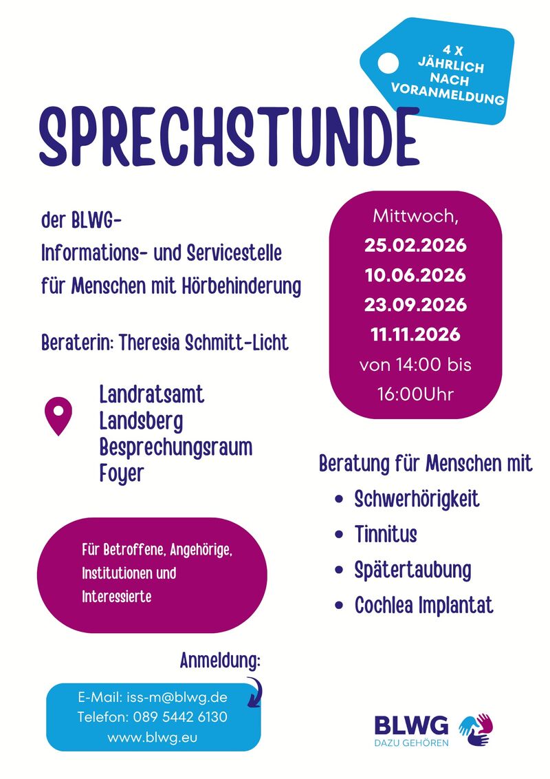 Neben der Beratung bietet die Servicestelle in München unter dem Motto „Forum für Andershörende“ Infoabende an zu Themen wie „Kultur in München mit Schwerhörigkeit erleben und genießen“, „Entspannung für Andershörende“, „Nonverbale Kommunikation“, „Gelingende Kommunikation mit Schwerhörigkeit“, „Schwerhörig – Barrierefreie Kommunikation in der Arbeitswelt“. Homepage:www.blwg.de