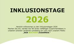 Unter dem Motto „WIR WACHSEN ZUSAMMEN.“ laden die Inklusionstage 2026 erneut zu einem vielfältigen Veranstaltungsprogramm im gesamten Landkreis Landsberg am Lech ein. Ziel ist es, Begegnungen zu schaffen, Barrieren abzubauen und das inklusive Miteinander weiter zu stärken. Von März bis Oktober erwartet Bürgerinnen und Bürger ein abwechslungsreiches Angebot aus Information, Mitmachaktionen und Austauschformaten. Plakat zu den Inklusionstagen PDF Format